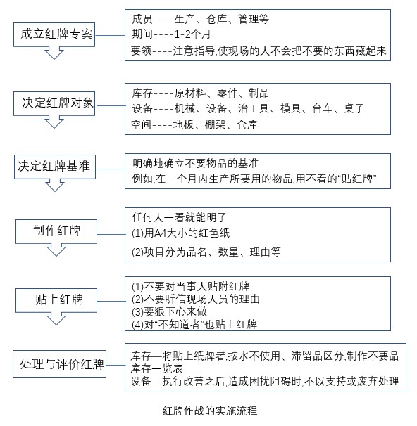 貼附的紅牌移往紅牌集中處后,應予以記錄。將貼上紙牌者,按永不使用、滯留品區(qū)分,制作不要品庫存一覽表,對于設(shè)備-執(zhí)行改善之后,造成困擾阻礙時,不以支持或廢棄處理。紅牌作戰(zhàn)看板流程具體細節(jié)內(nèi)容如上圖所示。